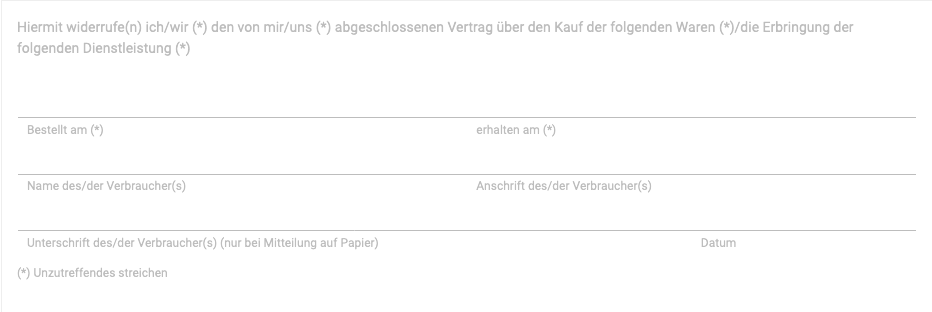 Sie haben die Waren unverzüglich und in jedem Fall spätestens binnen vierzehn Tagen ab dem Tag, an dem Sie uns über den Widerruf dieses Vertrages unterrichten, an uns zurückzusenden oder zu übergeben. Die Frist ist gewahrt, wenn Sie die Waren